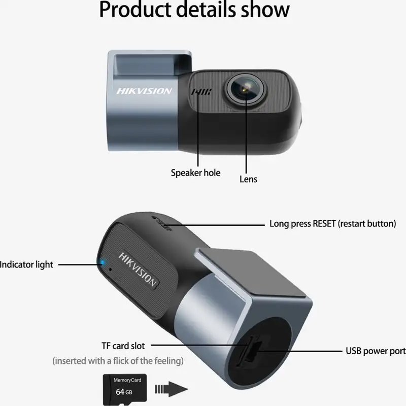 Dashcam voiture Hikvision conçue pour enregistrer chaque trajet avec une qualité d’image claire et fiable. Grâce à sa résolution Full HD et son objectif grand angle, elle capture les détails essentiels de la route, de jour comme de nuit, pour une conduite plus sereine et sécurisée.