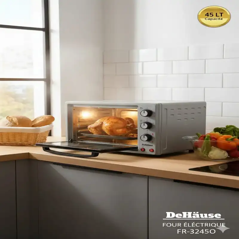 Four électrique conçu pour offrir une cuisson homogène et rapide, le four électrique DeHäuse FR-3245O vous garantit des résultats professionnels à la maison. Grâce à sa puissance stable et à sa chaleur parfaitement répartie, il rôtit, chauffe et gratine vos plats avec une précision remarquable.