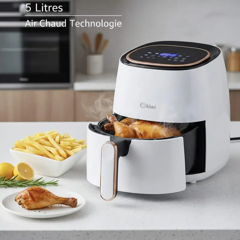 Friteuse à air sans huile conçue pour préparer des plats croustillants et savoureux avec peu ou pas de matière grasse. Grâce à sa technologie de circulation d’air chaud, elle garantit une cuisson homogène et rapide, idéale pour les frites, le poulet, les snacks et bien plus encore.