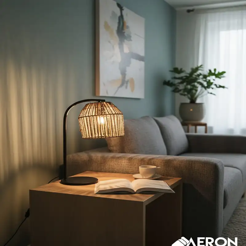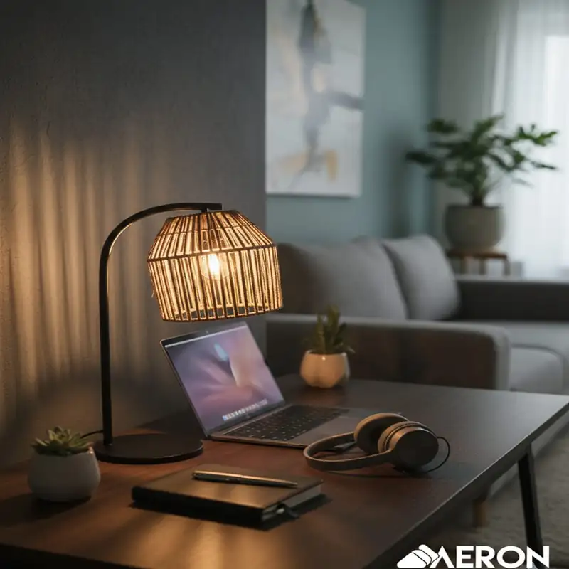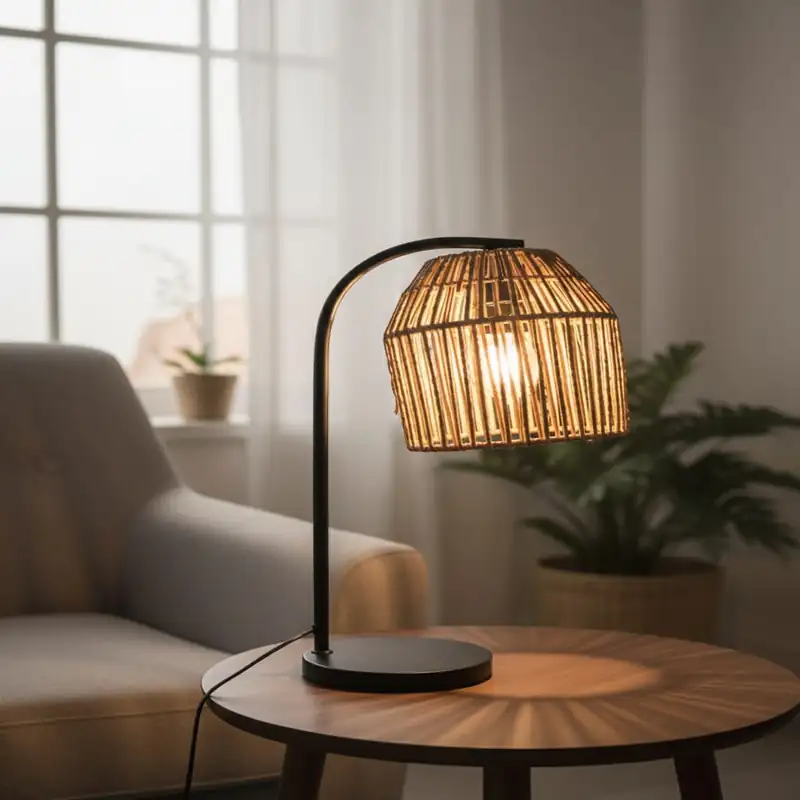 Lampe de bureau design pensée pour créer une ambiance chaleureuse et raffinée dans votre espace de travail ou votre intérieur. Son abat-jour ajouré en rotin diffuse une lumière douce et agréable, idéale pour le bureau, le salon ou la chambre.